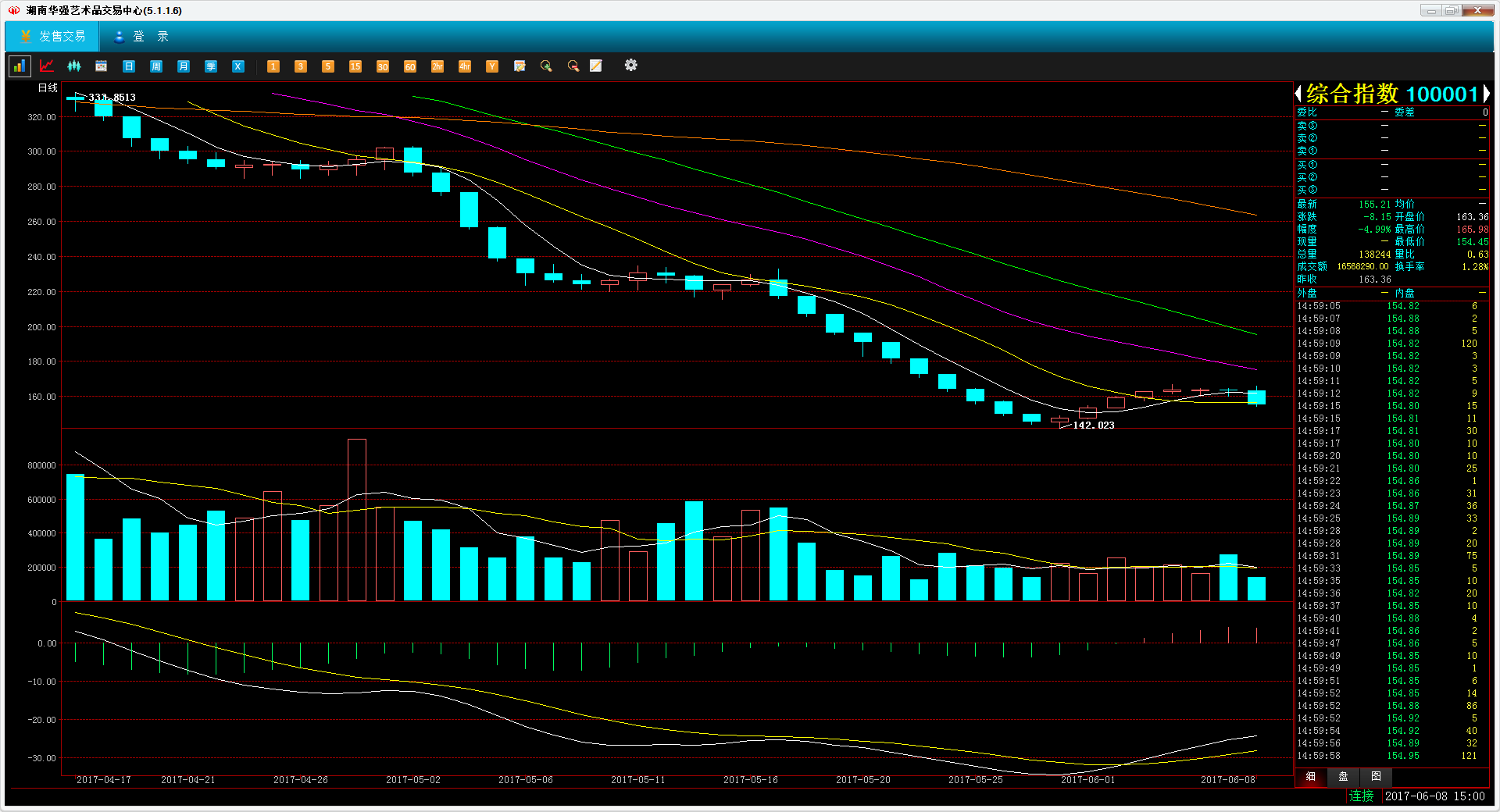 今日市場走出逐級回落的行情。綜合指數(shù)收于155.21點,跌4.99%,成交0.16億元。藝術(shù)品指數(shù)收于24.45點,跌6.70%。收藏品指數(shù)收于175.79點,跌5.29%。全市有11家上漲(1家漲停),有38家下跌(19家跌停)。